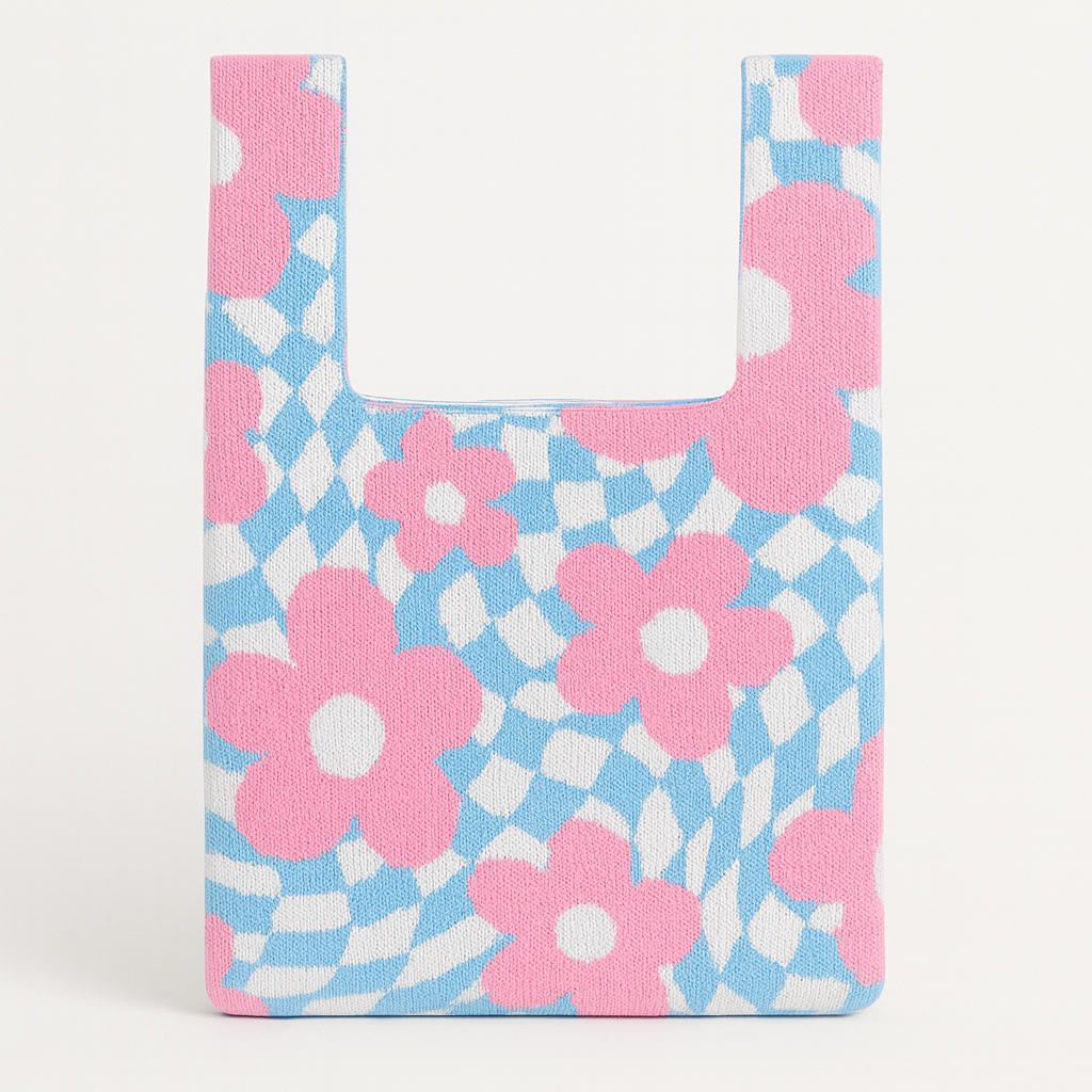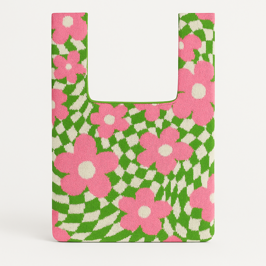 Hand-woven from soft cotton, this reusable bag brings retro charm with its pink blooms set against a swirling green background. The pattern plays between floral softness and optical rhythm, making it both nostalgic and bold.