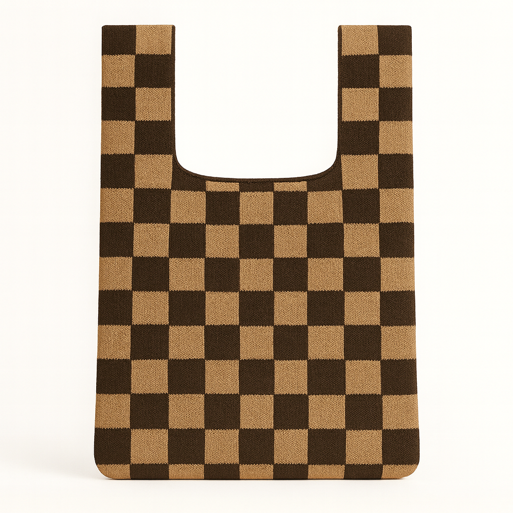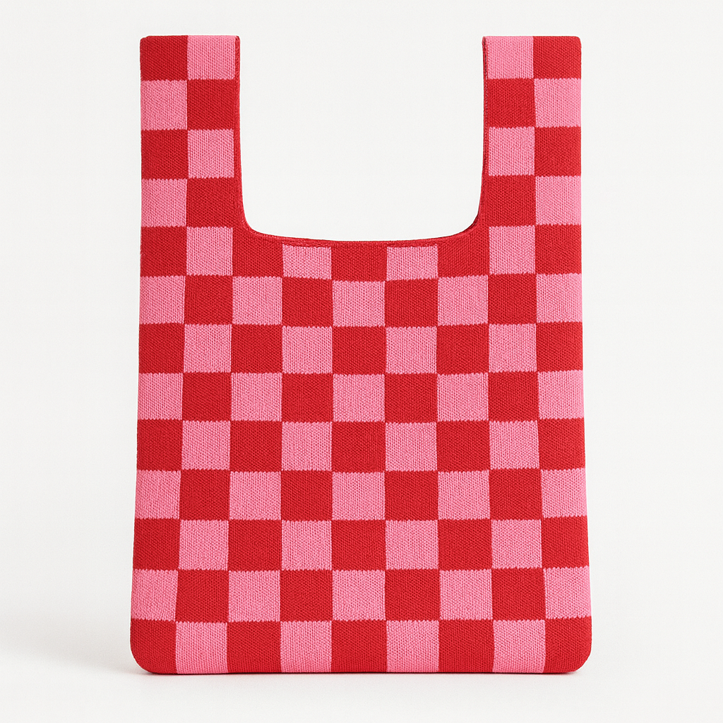 Knitted from 100% recycled yarns, this eco-conscious bag reimagines the classic checkerboard pattern in vivid red and pink. The textured knit offers softness and flexibility while keeping the silhouette clean and modern.