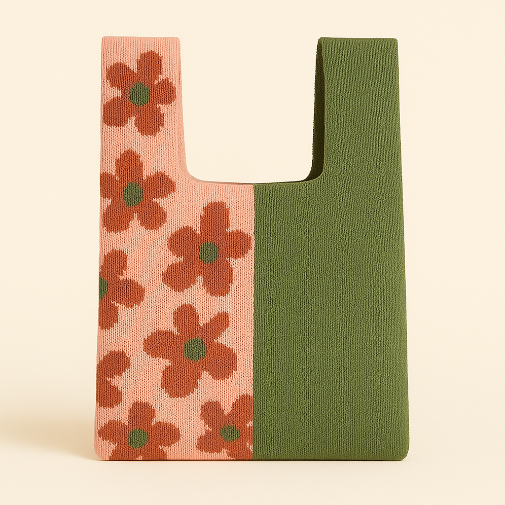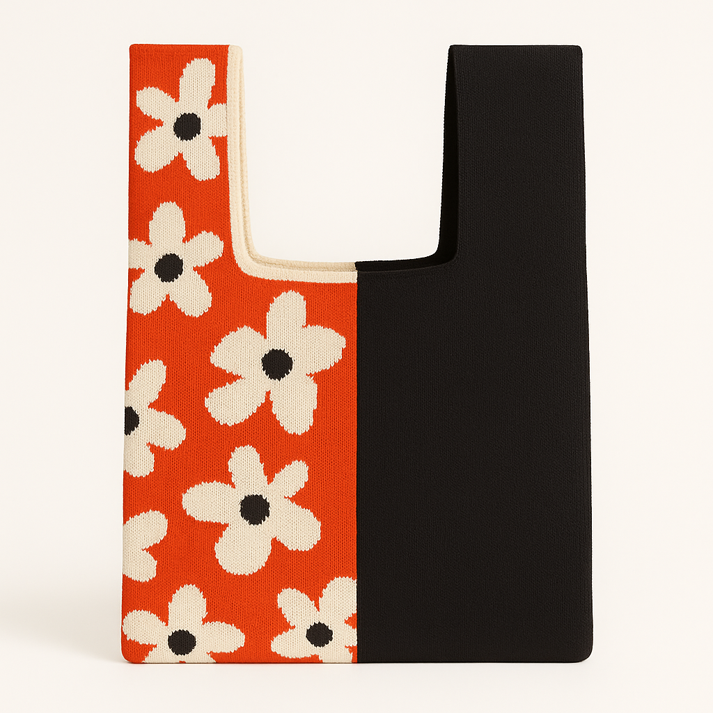 Crafted from 100% recycled yarns, this unique bag pairs a nostalgic orange floral knit with a solid black panel for bold contrast. The split design gives a modern twist to vintage charm — half fun, half minimal.