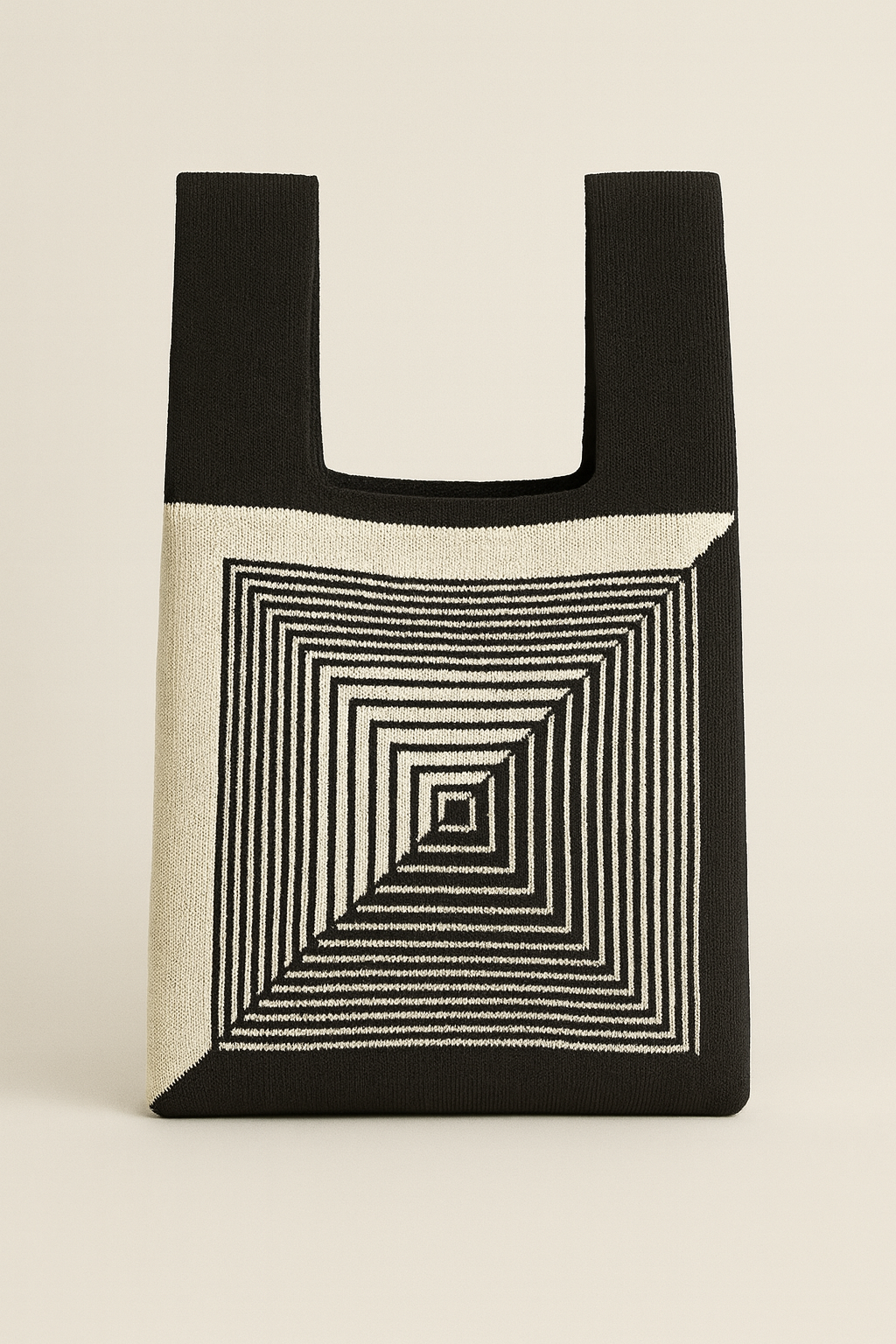 A bold interplay of geometry and texture — this hand-woven cotton bag features concentric squares that create a striking optical rhythm in black and cream. Modern yet timeless, it brings a touch of graphic sophistication to your everyday routine.