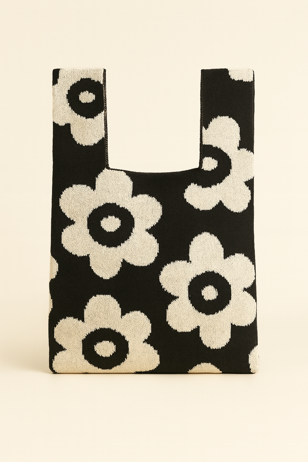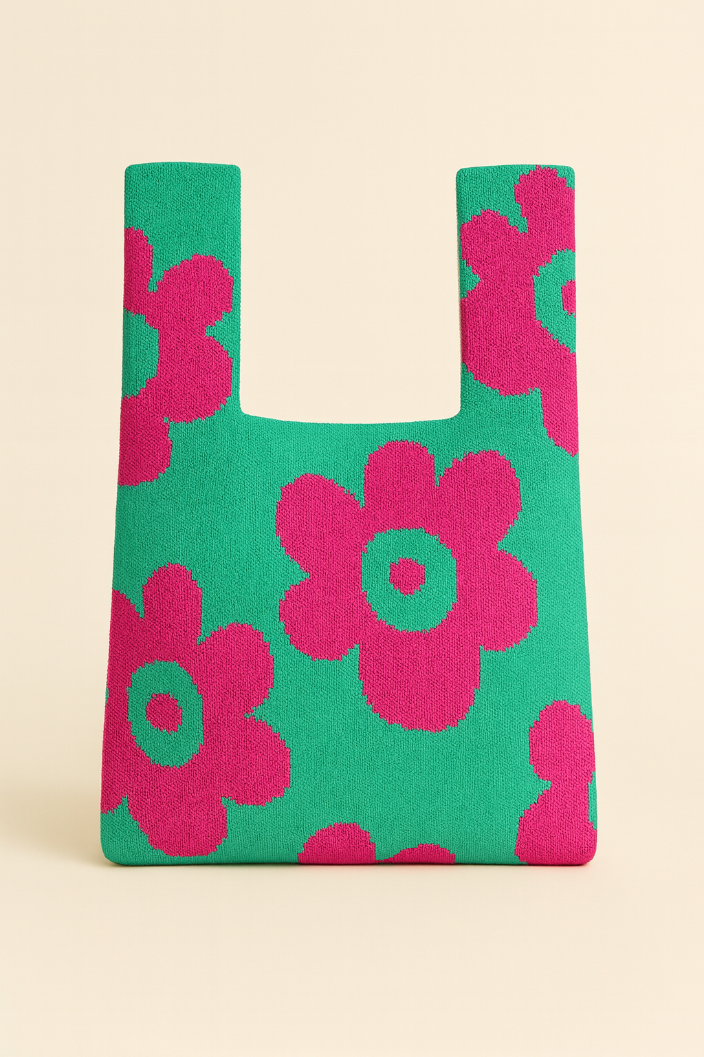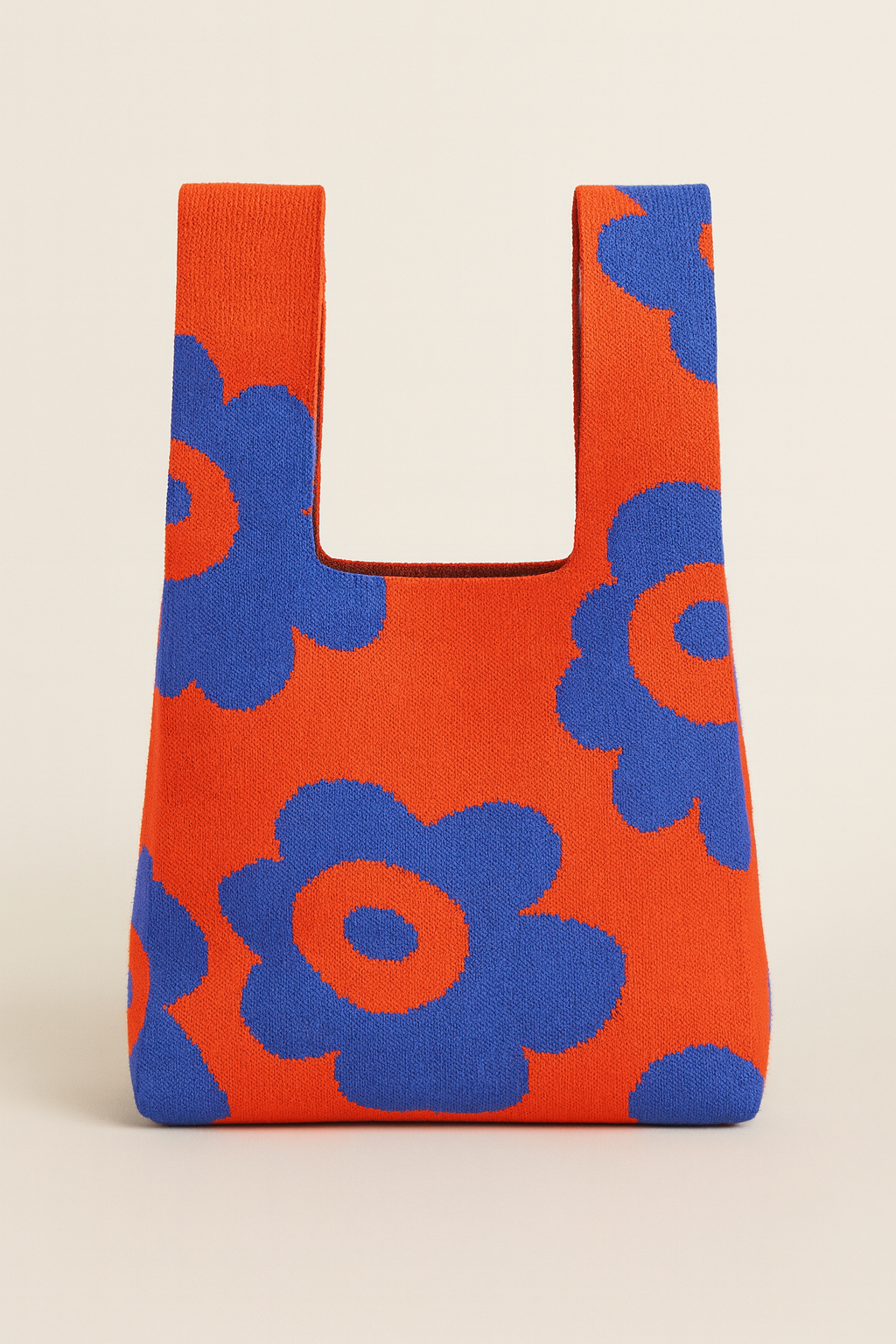 Knitted from 100% recycled yarns, this bold floral bag radiates retro optimism. Bright blue flowers bloom across a vivid orange background, giving the soft knit body both energy and personality.