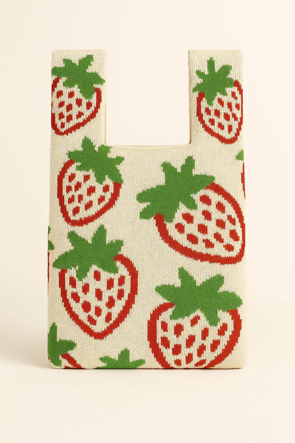 Hand-woven from soft cotton, this reusable bag captures the charm of a summer strawberry field. The creamy background is dotted with bright red berries and fresh green leaves — cheerful, warm, and instantly uplifting.