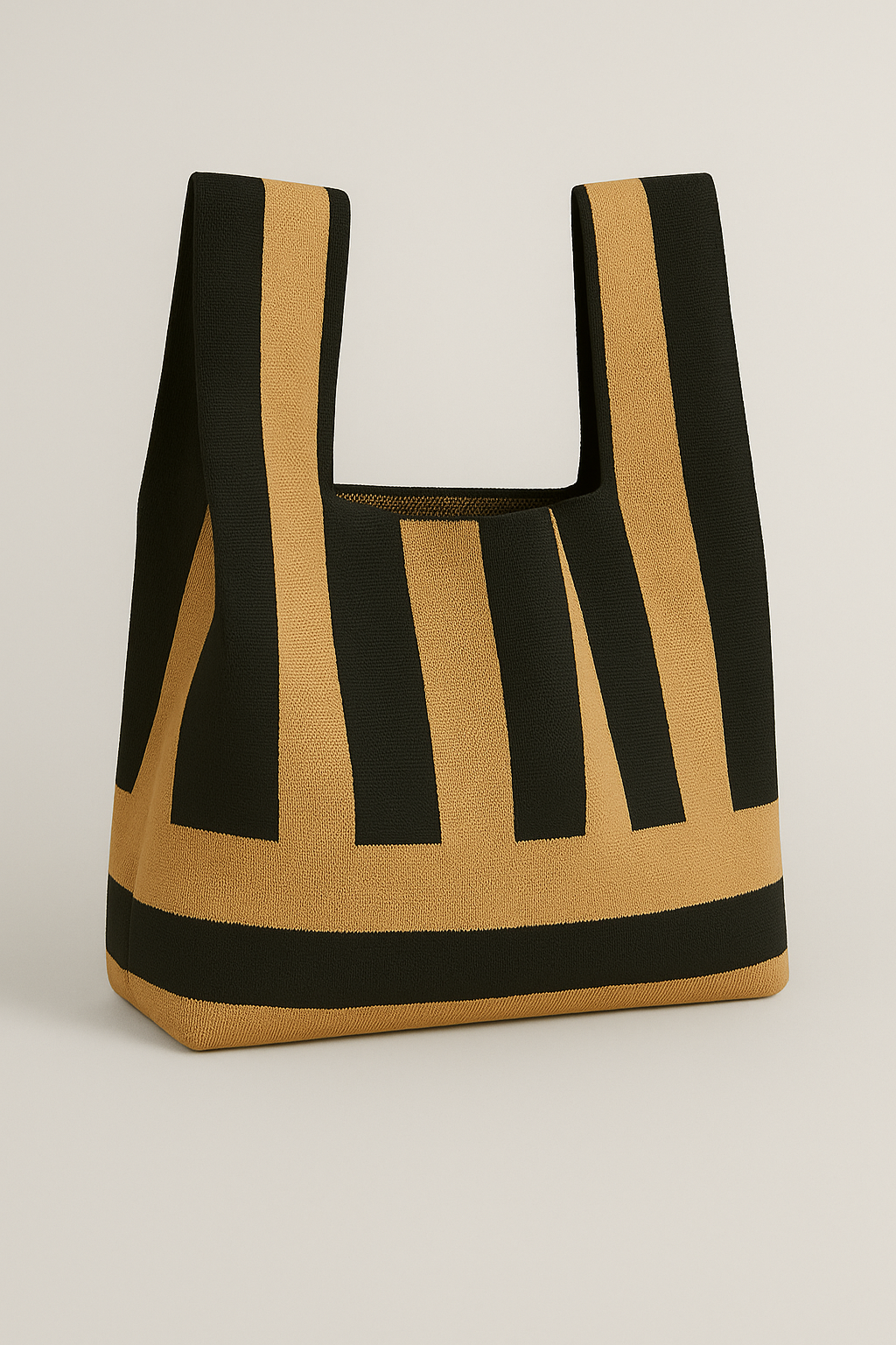 A bold balance of structure and softness — this reusable bag features vertical black stripes over a honey-gold cotton weave. Its strong contrast and clean rhythm evoke modern architecture and timeless design.